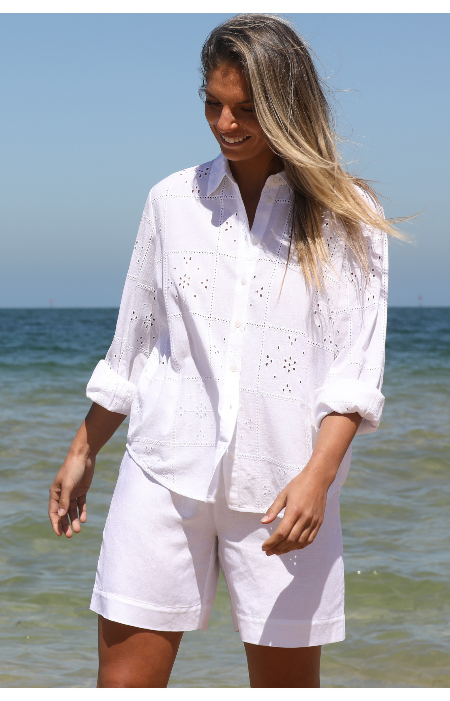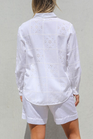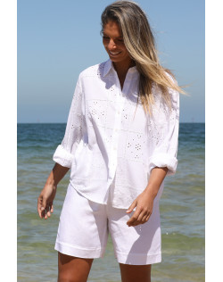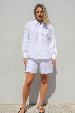 Elevate your wardrobe with this refined long sleeve shirt crafted from a breathable linen/cotton blend for effortless comfort and timeless appeal. Designed with a classic two-piece collar and centre front fastening the shirt is finished with natural shell buttons. A striking all-over self-coloured embroidery lends feminine appeal making this piece a stand-out in understated elegance. The curved shirt tail hemline offers a flattering silhouette, ideal for both casual and elevated styling. Available exclusively in white, coordinate with pants, shorts or jeans for effortless day-to-night dressing – add a blazer to complete the look.