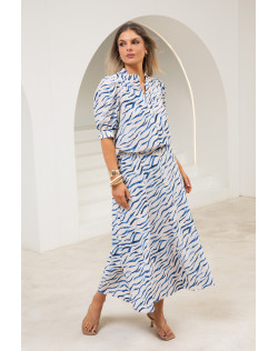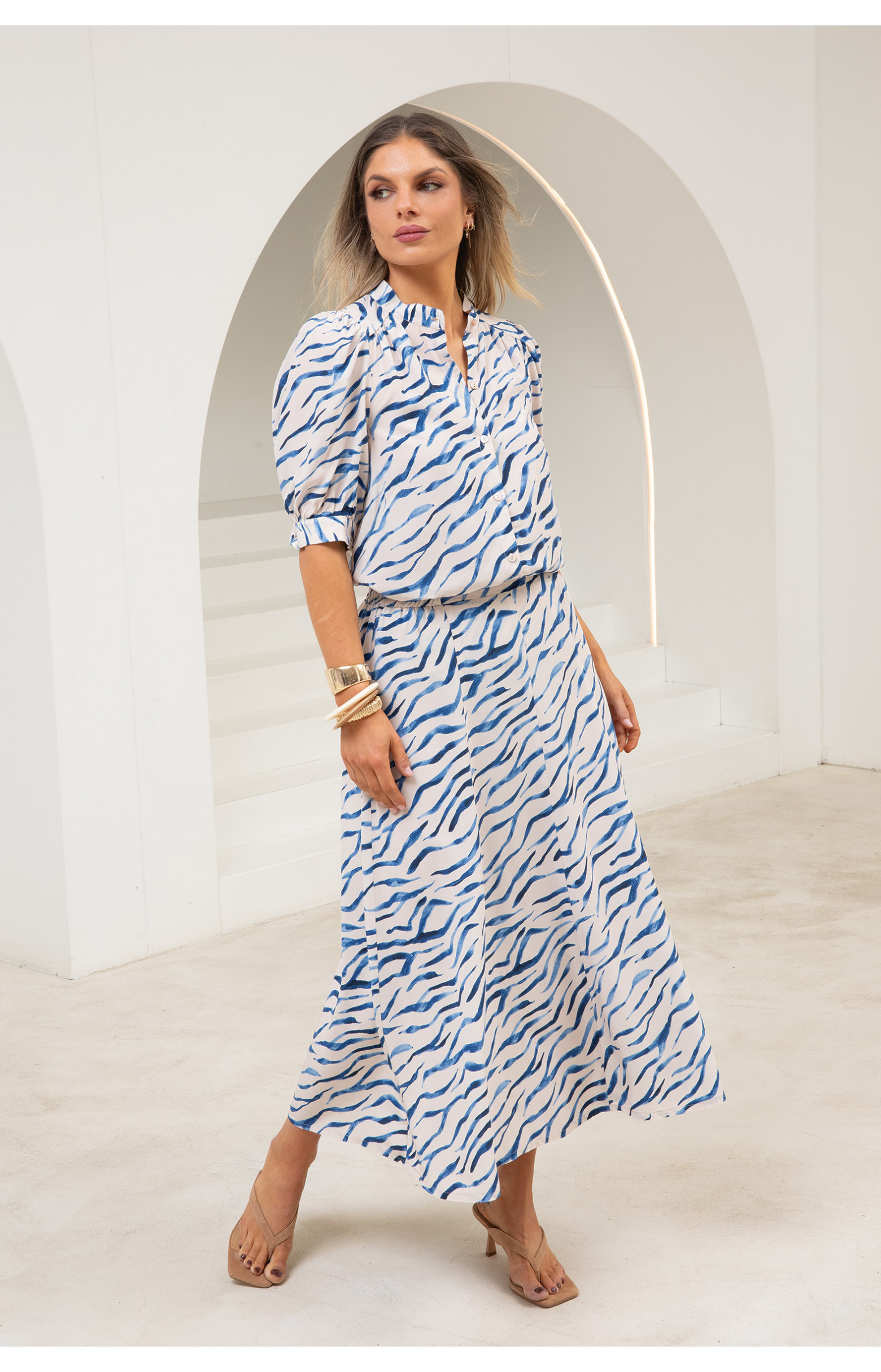 Add a feminine touch to your wardrobe with this beautifully detailed blouse made from breathable woven EcoVero rayon. Showcasing a striking abstract print, it is offered in two elegant colourways: rich chocolate tones on a beige background and calming shades of blue on an ivory base. Designed with a refined collar stand from the button-through front fastening, the blouse features a yoke at the shoulder with feminine gathers both back and front adding subtle volume and soft drape. The short sleeves sit just above the elbow and feature soft gathers at both the head and narrow band at the opening. Effortlessly balancing tailored detail with a relaxed feminine feel, wear it as a matching set with the Mirage skirt or shorts or contrast it with the Lumina Wide Leg Pants in chocolate.