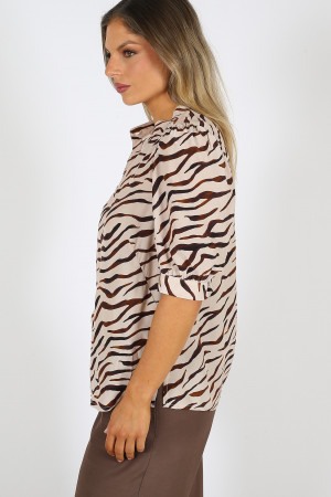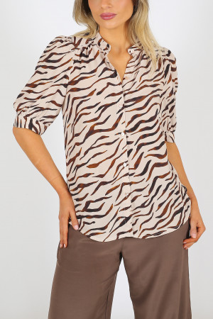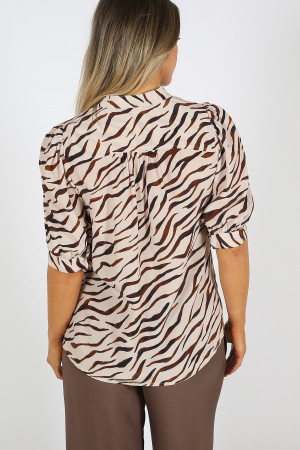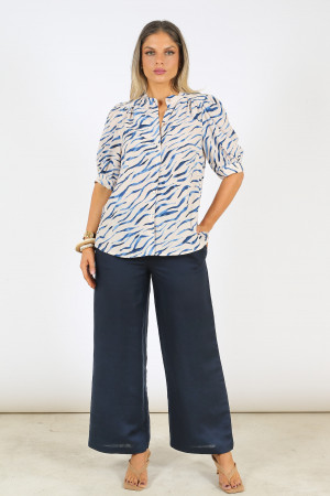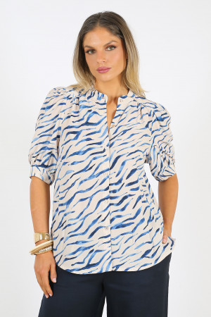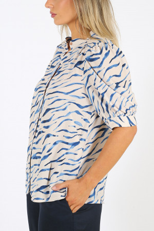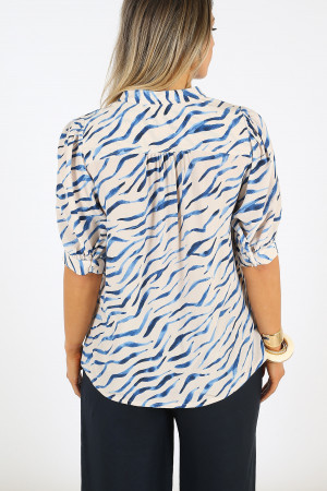 Add a feminine touch to your wardrobe with this beautifully detailed blouse made from breathable woven EcoVero rayon. Showcasing a striking abstract print, it is offered in two elegant colourways: rich chocolate tones on a beige background and calming shades of blue on an ivory base. Designed with a refined collar stand from the button-through front fastening, the blouse features a yoke at the shoulder with feminine gathers both back and front adding subtle volume and soft drape. The short sleeves sit just above the elbow and feature soft gathers at both the head and narrow band at the opening. Effortlessly balancing tailored detail with a relaxed feminine feel, wear it as a matching set with the Mirage skirt or shorts or contrast it with the Lumina Wide Leg Pants in chocolate.
