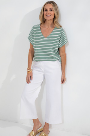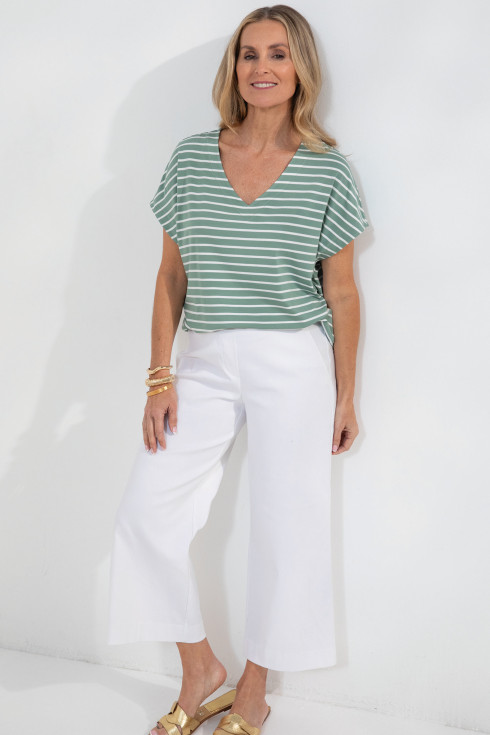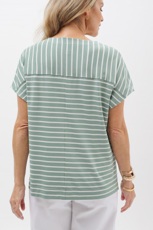 Elevate your everyday wardrobe with this versatile yarn dyed stripe tee. Designed with an extended shoulder line and a flattering V shape neckline the back panel features a deep yoke at the shoulder with the stripes cut in a vertical direction. Featuring a relaxed silhouette it is the perfect choice for casual weekend destinations. Easy to wear, comfortable and timeless.