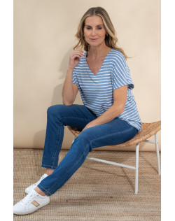 Elevate your everyday wardrobe with this versatile yarn dyed stripe tee. Designed with an extended shoulder line and a flattering V shape neckline the back panel features a deep yoke at the shoulder with the stripes cut in a vertical direction. Featuring a relaxed silhouette it is the perfect choice for casual weekend destinations. Easy to wear, comfortable and timeless.
