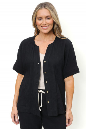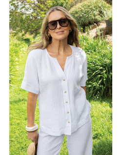 Cotton gauze button-through short sleeve top