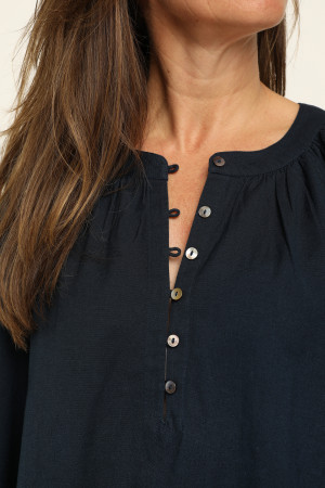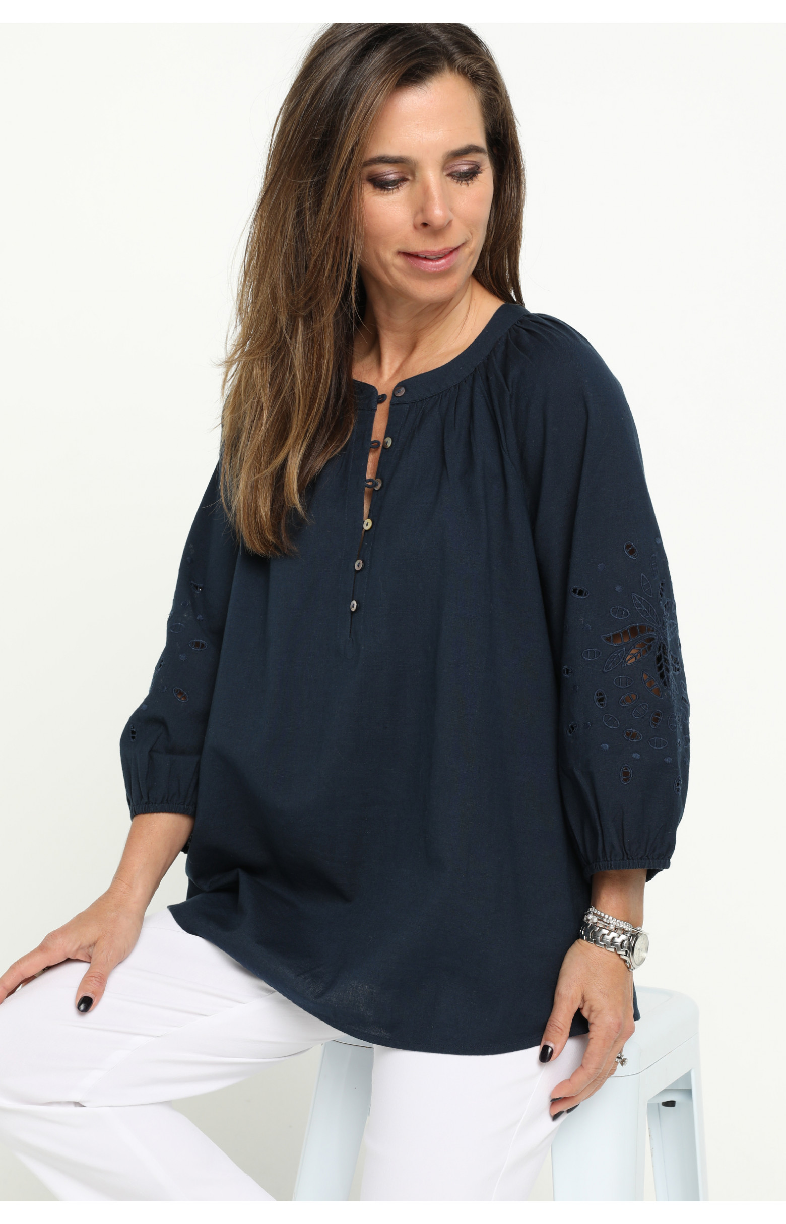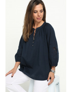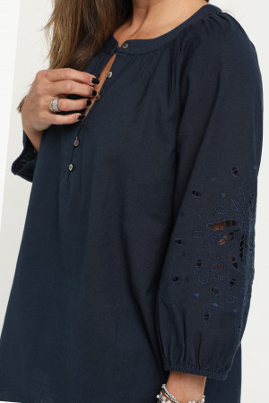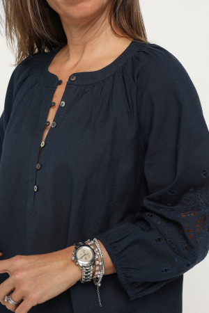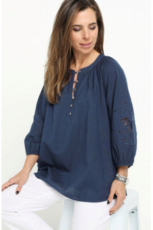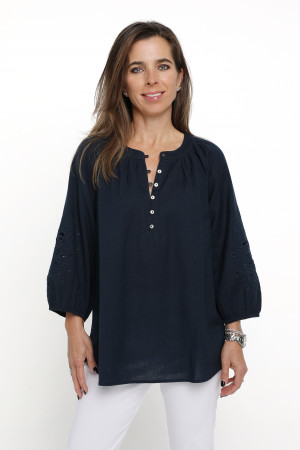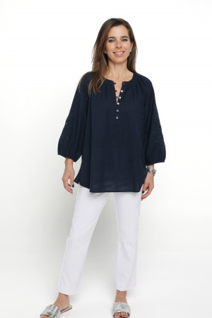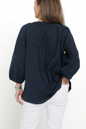 Crafted from a breathable linen/cotton blend this blouse exudes effortless style with its feminine drape and natural texture. The round neckline is framed by soft gathers, adding subtle volume and the straight hemline is finished with a split in each side seam. A front button placket, featuring natural shell buttons and fine rouleaux loops, adds a refined touch. Three quarter length raglan sleeves enhance the relaxed silhouette and feature a striking panel of tonal cut-out embroidery. Perfectly balanced between casual and elevated, this versatile navy blouse is ideal for warm weather dressing coordinated with shorts, pants or jeans.