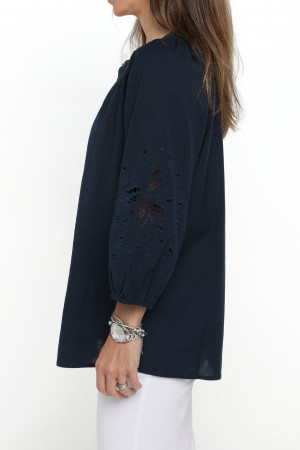 Linen blend blouse with embroidered sleeves