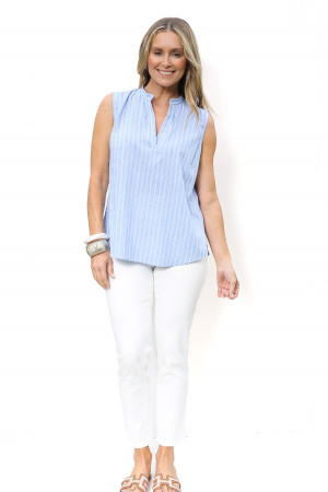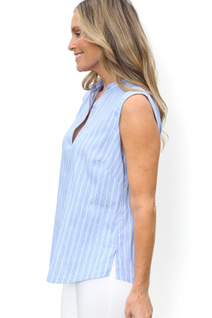This sleeveless blouse is crafted from a soft rayon/cotton yarn dyed stripe, offering a lightweight feel with natural drape. The notched V-shape neckline adds a clean modern touch and soft gathers beneath the back collar stand add gentle volume and ease through the silhouette. The hemline is softly curved and splits in the side seams enhance comfort and movement. Effortless and versatile, this blouse brings relaxed sophistication to everyday dressing.