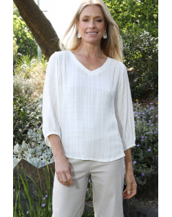 Crafted from a luxuriously soft-to-the-touch viscose/rayon, this blouse features a subtle shadow check pattern that adds texture and depth to its plain dyed finish. The design features a flattering V-shape neckline with soft gathers at both front and back, creating a gentle, feminine drape. The three-quarter length sleeves are finished with elasticised cuffs, providing comfort and a hint of volume for a stylish, relaxed look. Complete with a gently curved hemline, it is easy to style tucked in or left out for a timeless, flowing silhouette. Versatile, effortlessly chic and comfortable to wear this blouse will transition seamlessly from work to weekend in style.